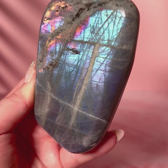 Discover the mesmerizing beauty of this Madagascar labradorite freeform, a unique polished stone showcasing rainbow flashes of blue and pink. Sourced directly from Madagascar, this one-of-a-kind crystal makes a stunning addition to your collection, meditation space, or home display. Its natural patterns and iridescent shimmer ensure that no two stones are alike.