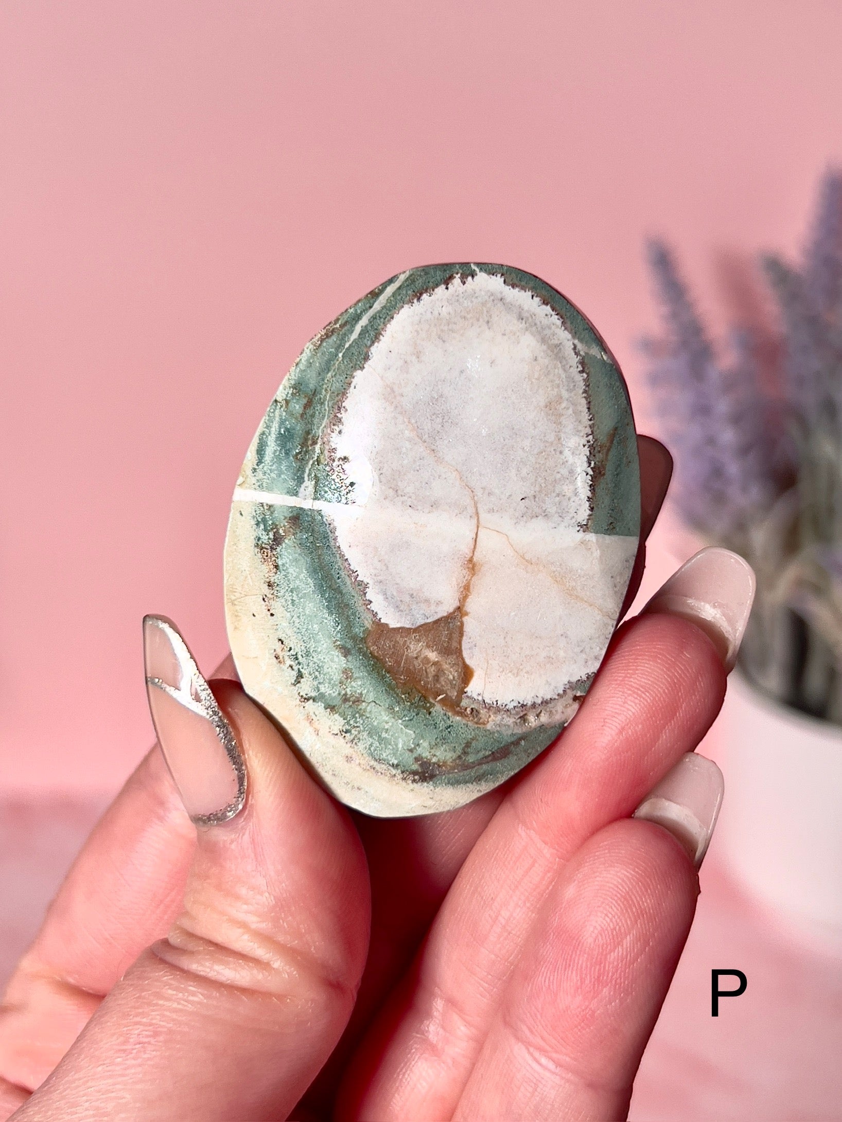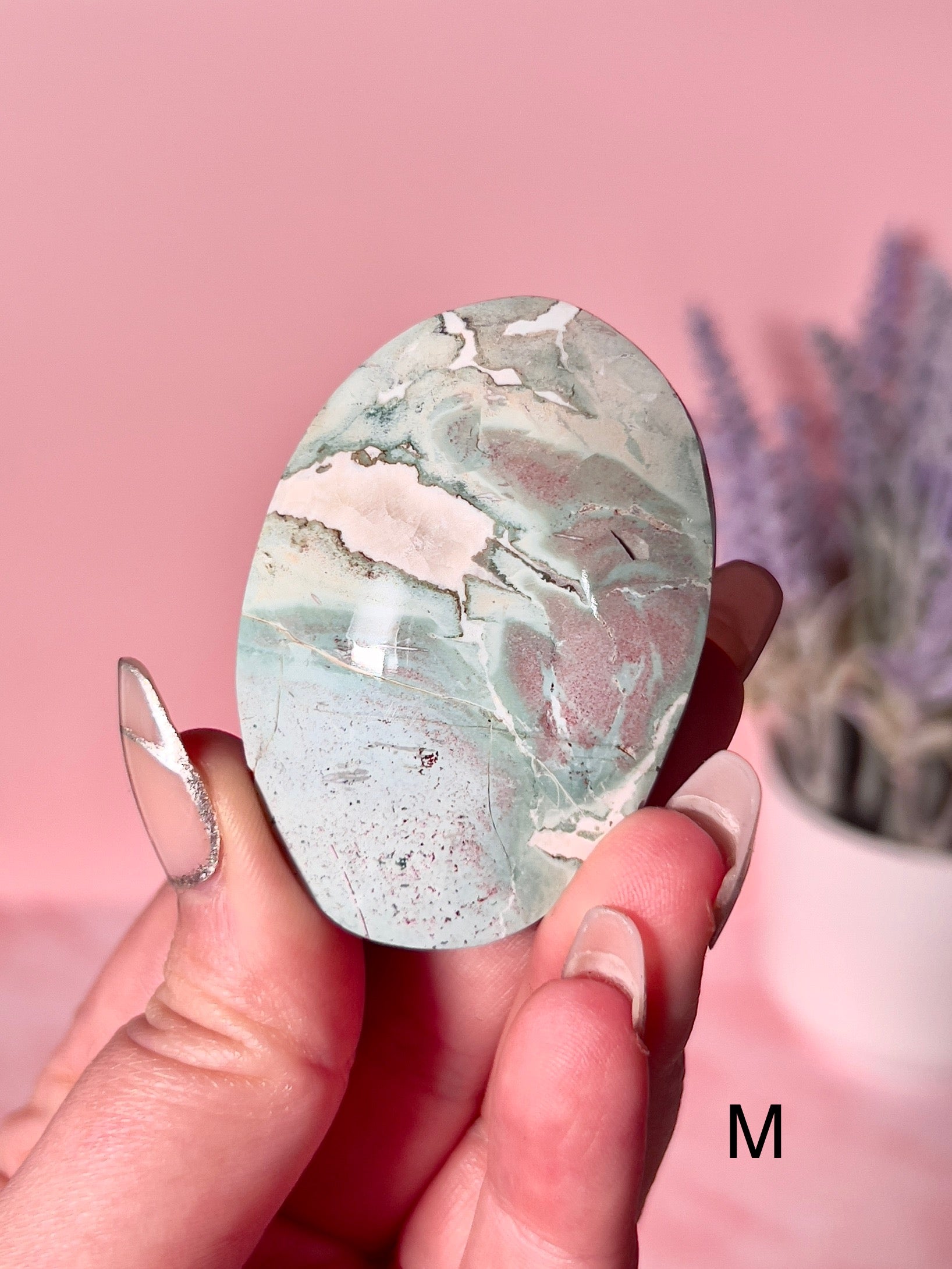 Add a touch of calm and natural charm to your space with these Unicorn Jasper palm stones, polished to a smooth finish that feels grounding and soothing in the hand. Each piece displays unique patterns of soft pink, cream, and mint green tones, making every stone one-of-a-kind. Perfect for display, collection, or as a thoughtful gift.