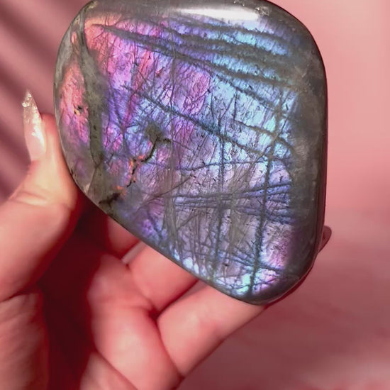 Discover the mesmerizing beauty of this Madagascar labradorite freeform, a unique polished stone showcasing rainbow flashes of blue, pink and purple. Sourced directly from Madagascar, this one-of-a-kind crystal makes a stunning addition to your collection, meditation space, or home display. Its natural patterns and iridescent shimmer ensure that no two stones are alike.