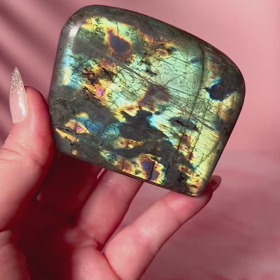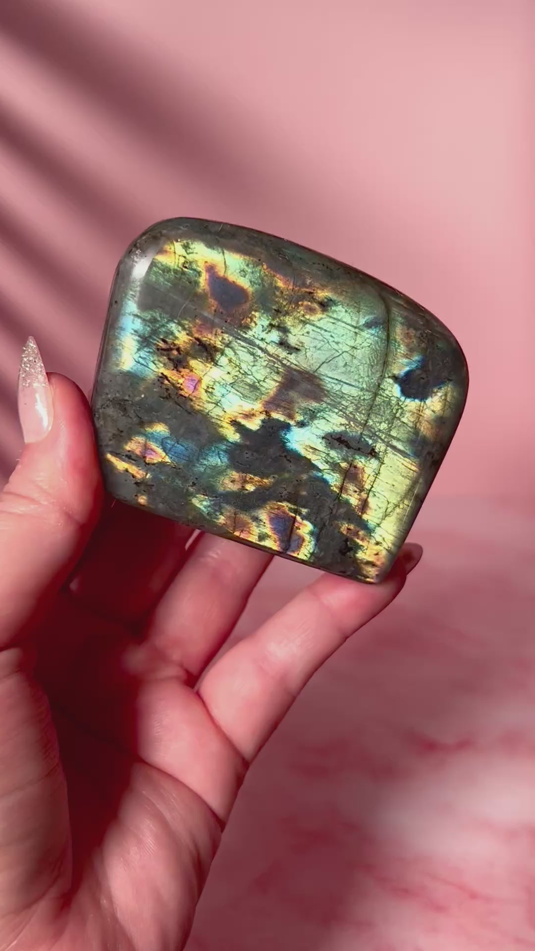 Discover the mesmerizing beauty of this Madagascar labradorite freeform, a unique polished stone showcasing rainbow flashes of blue, green, purple, orange, and yellow. Sourced directly from Madagascar, this one-of-a-kind crystal makes a stunning addition to your collection, meditation space, or home display. Its natural patterns and iridescent shimmer ensure that no two stones are alike.
