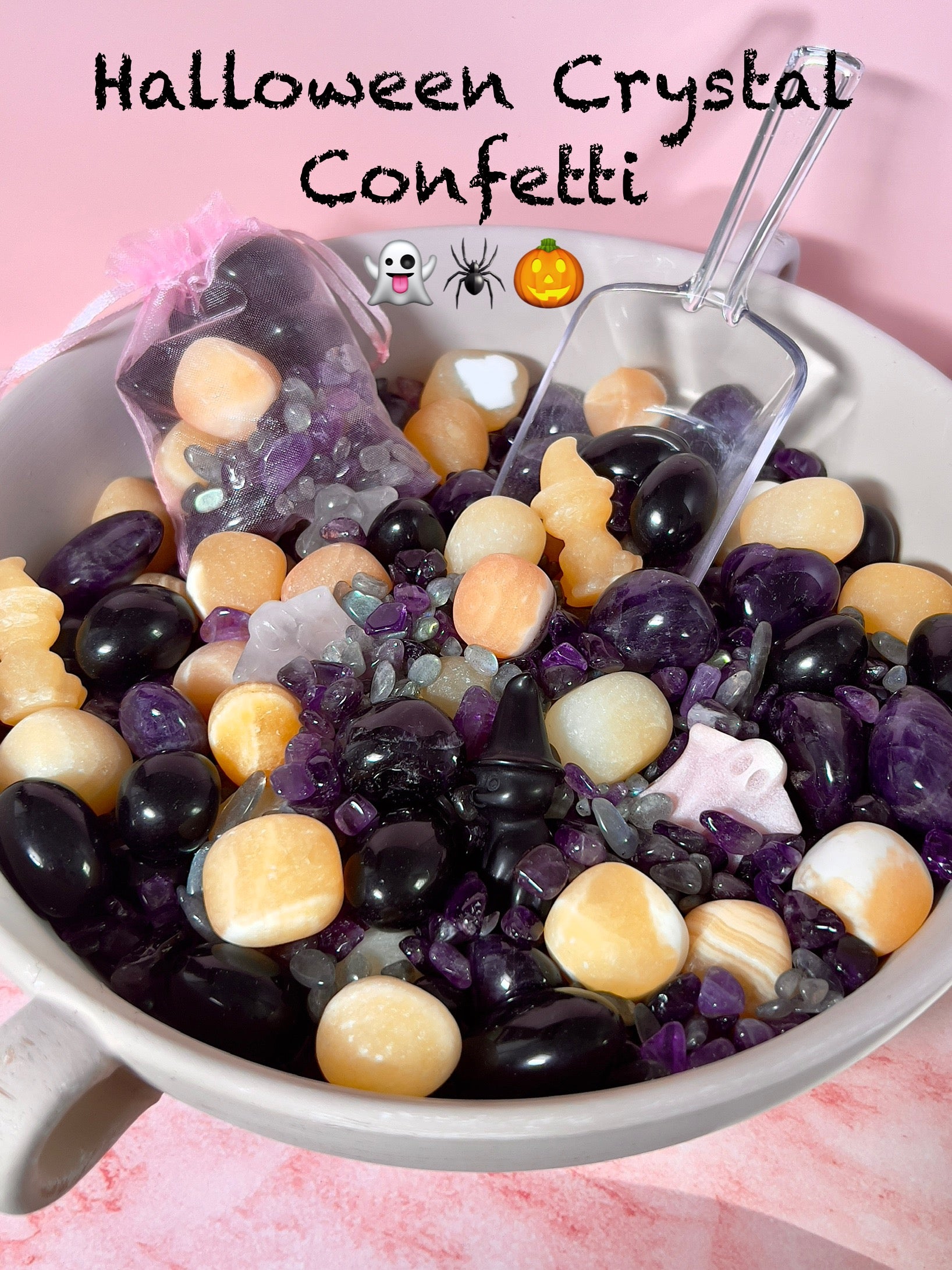 • Carvings: Obsidian Cat, Orange Calcite Cat, Yooperlite Pumpkin, Pink Opal Ghost, Quartz Ghost