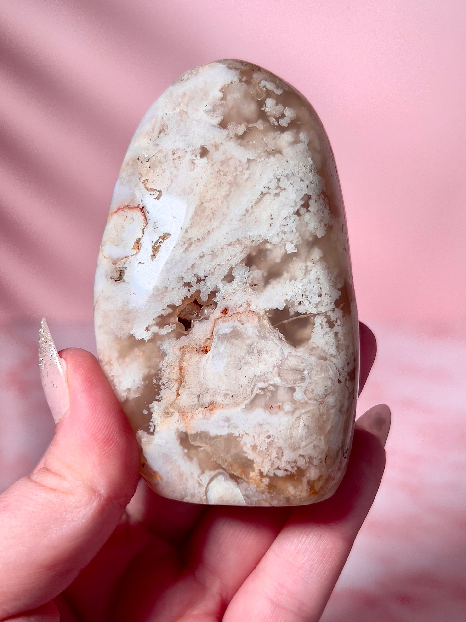 Elevate your space with the serene energy and organic beauty of flower agate freeforms, each selected for its unique charm and natural character.