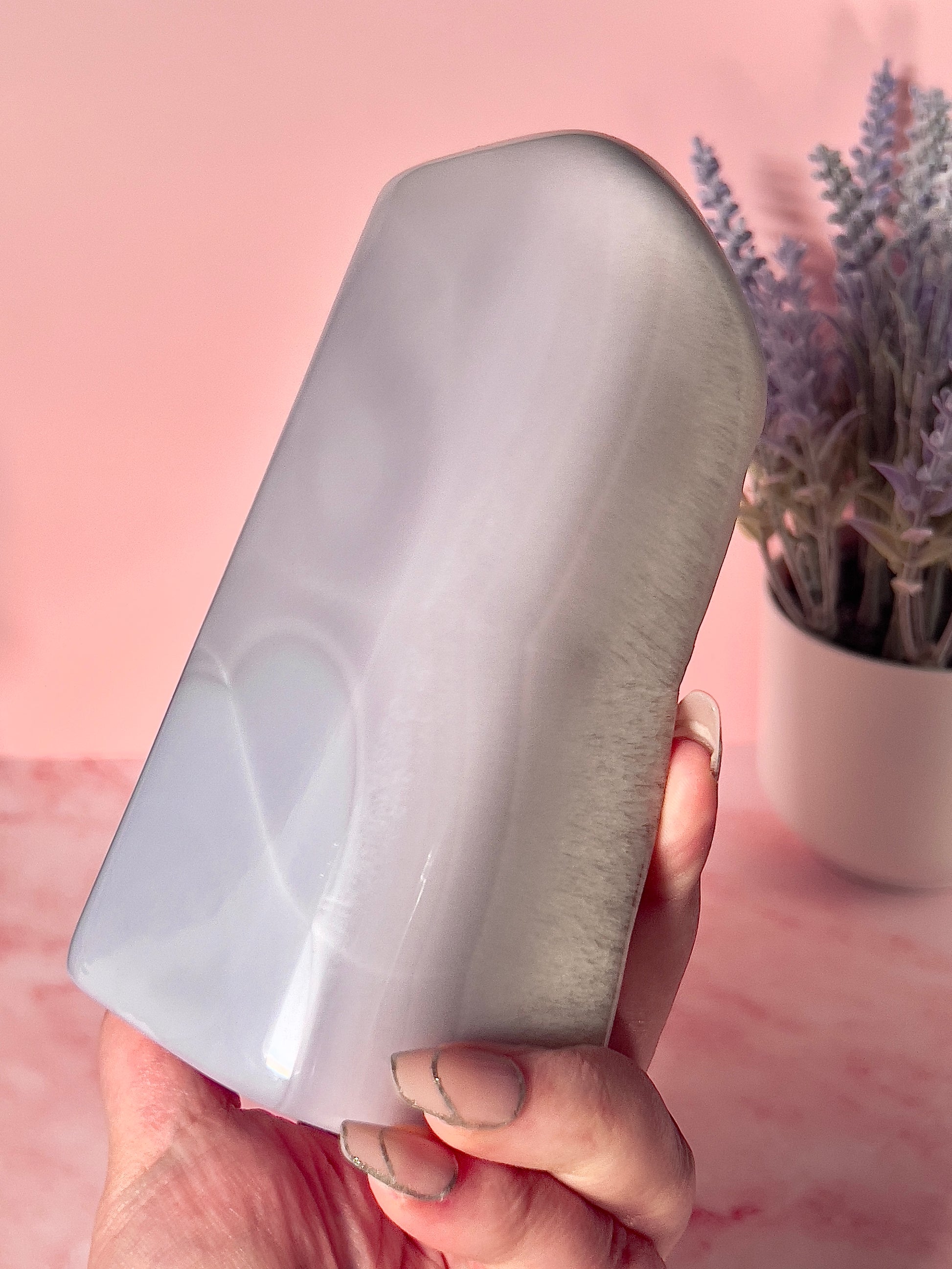 Discover the serene beauty of this Lavender Fluorite freeform, a one-of-a-kind polished crystal showcasing soft purple and lilac hues with natural banding and gentle translucence. Each piece is unique, offering a calming aesthetic perfect for display or meditation.