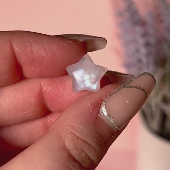 Delight in the mystical beauty of these mini high-quality rainbow moonstone stars, each polished to reveal flashes of blue, gold, and rainbow colors unique to every piece. Perfect for crystal collections, meditation, or as a charming gift, these stars add a touch of iridescent magic to any space.