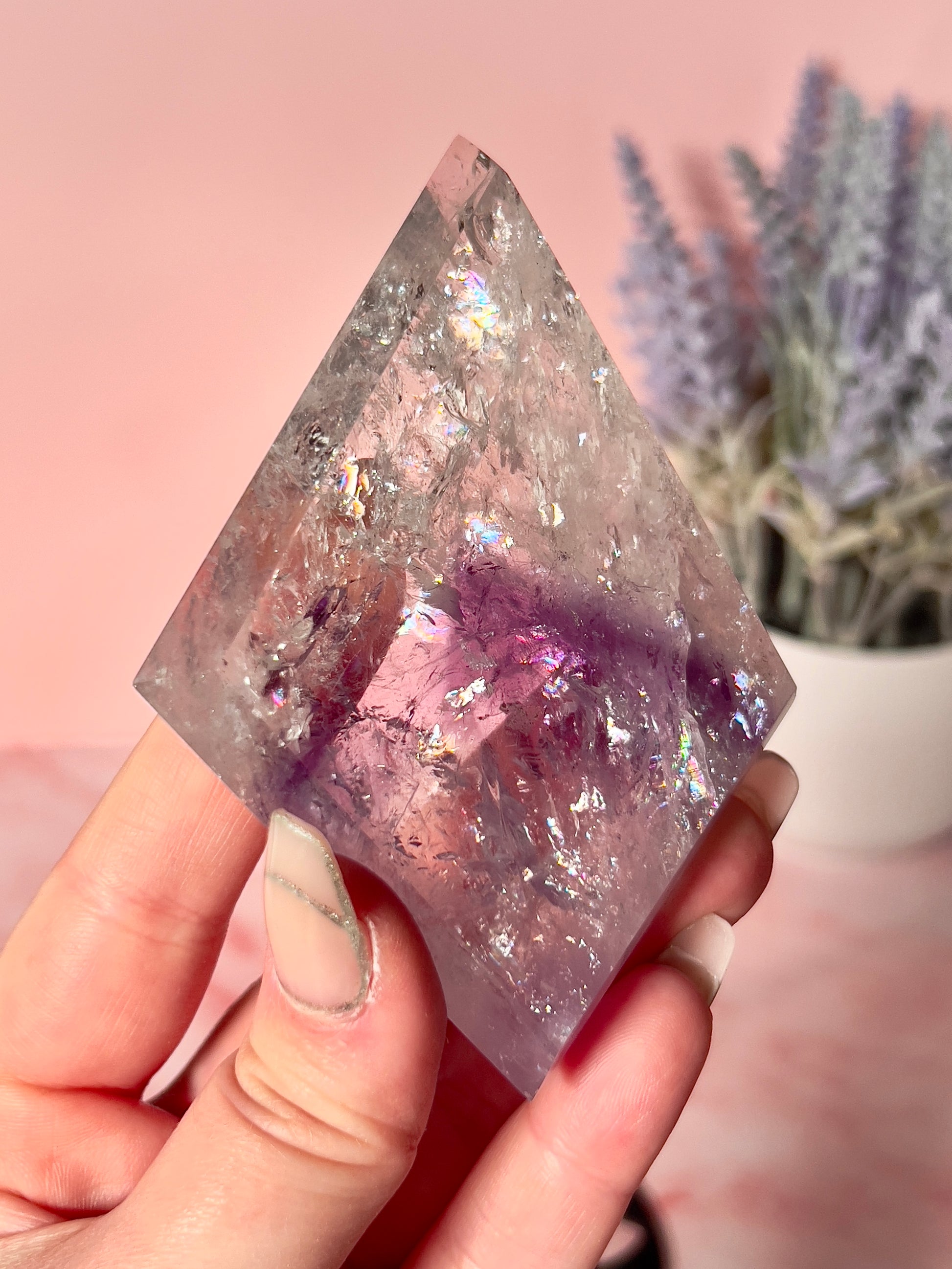 This Phantom Amethyst Diamond on a custom black stand showcases natural phantom formations within the crystal, revealing layers of its growth over time. A striking addition to your collection, meditation space, or home display.