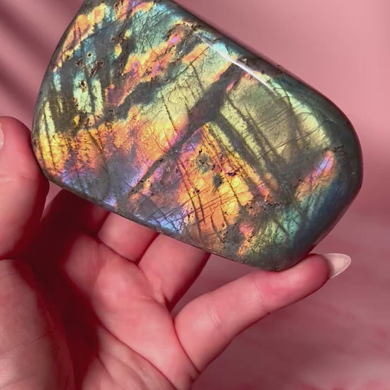 Discover the mesmerizing beauty of this Madagascar labradorite freeform, a unique polished stone showcasing rainbow flashes of blue, green, purple, orange, and yellow. Sourced directly from Madagascar, this one-of-a-kind crystal makes a stunning addition to your collection, meditation space, or home display. Its natural patterns and iridescent shimmer ensure that no two stones are alike.