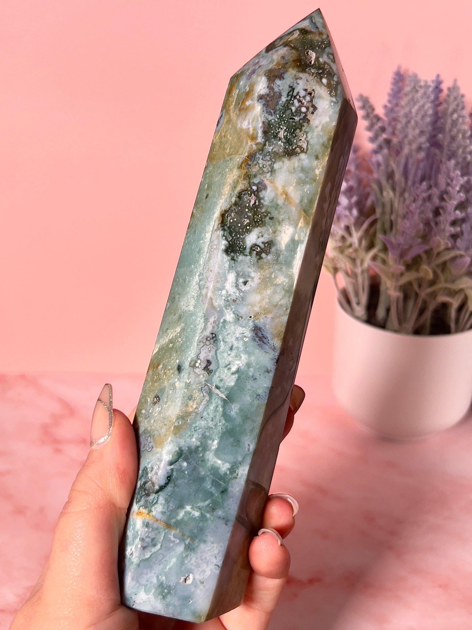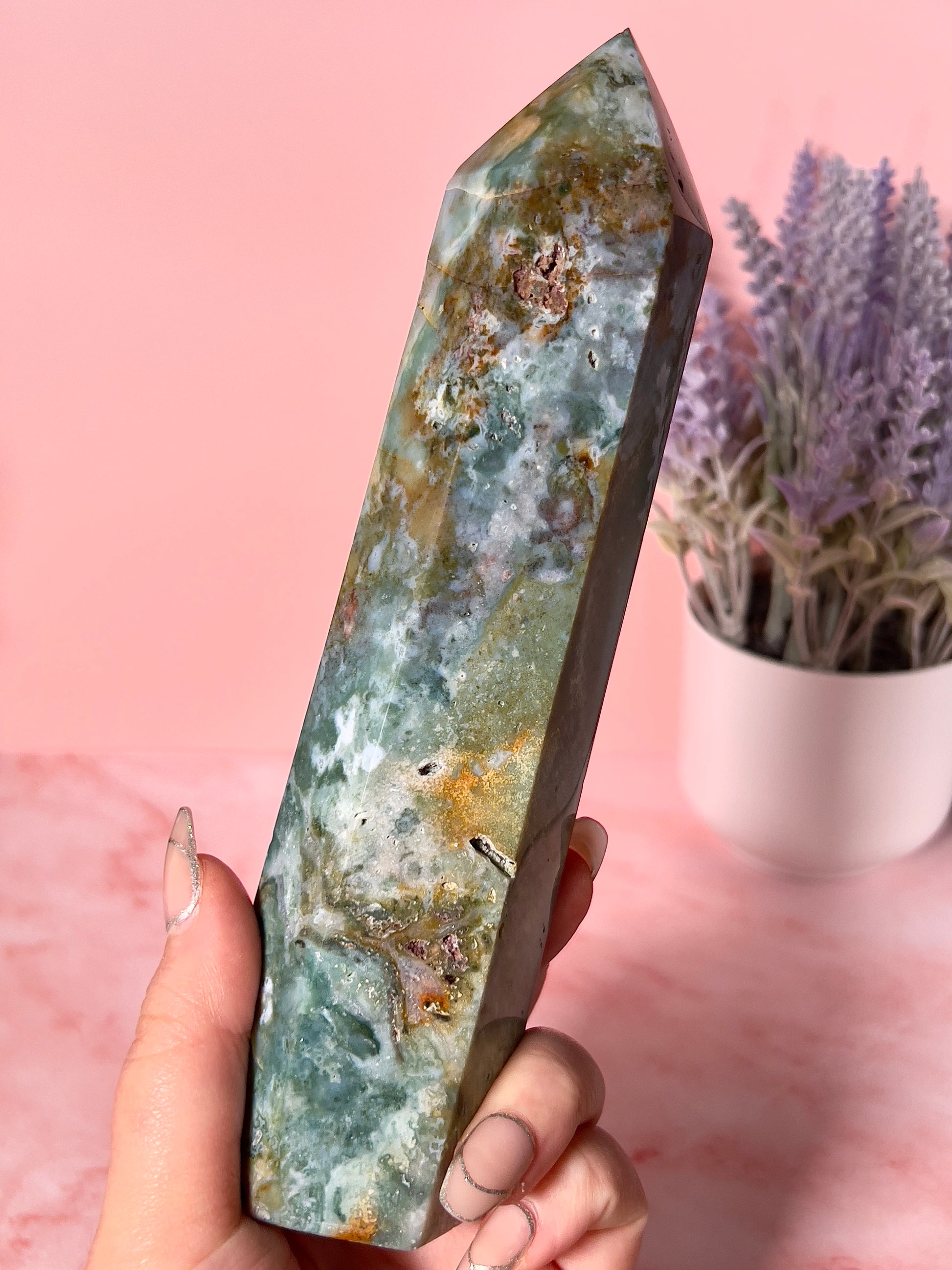 Discover the captivating patterns of this Madagascar sea jasper tower, a polished crystal displaying tones of pastel blue, yellow, and green. Each tower is uniquely shaped, making it a one-of-a-kind addition to your crystal collection, meditation space, or home display. Its natural banding and polished finish highlight the stone’s organic beauty and grounding energy.