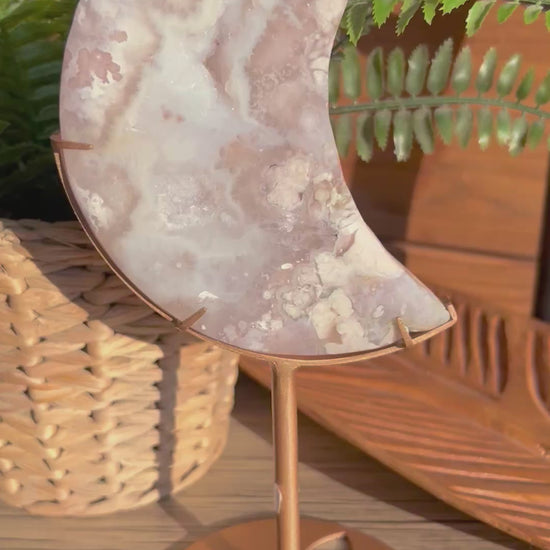 Discover the enchanting beauty of this Madagascar flower agate moon, a statement crystal featuring soft pastel pink and blue hues with intricate, flower-like patterns. Polished to a smooth shine, this one-of-a-kind piece radiates gentle, feminine energy and makes a stunning addition to any collection, altar, or home display.