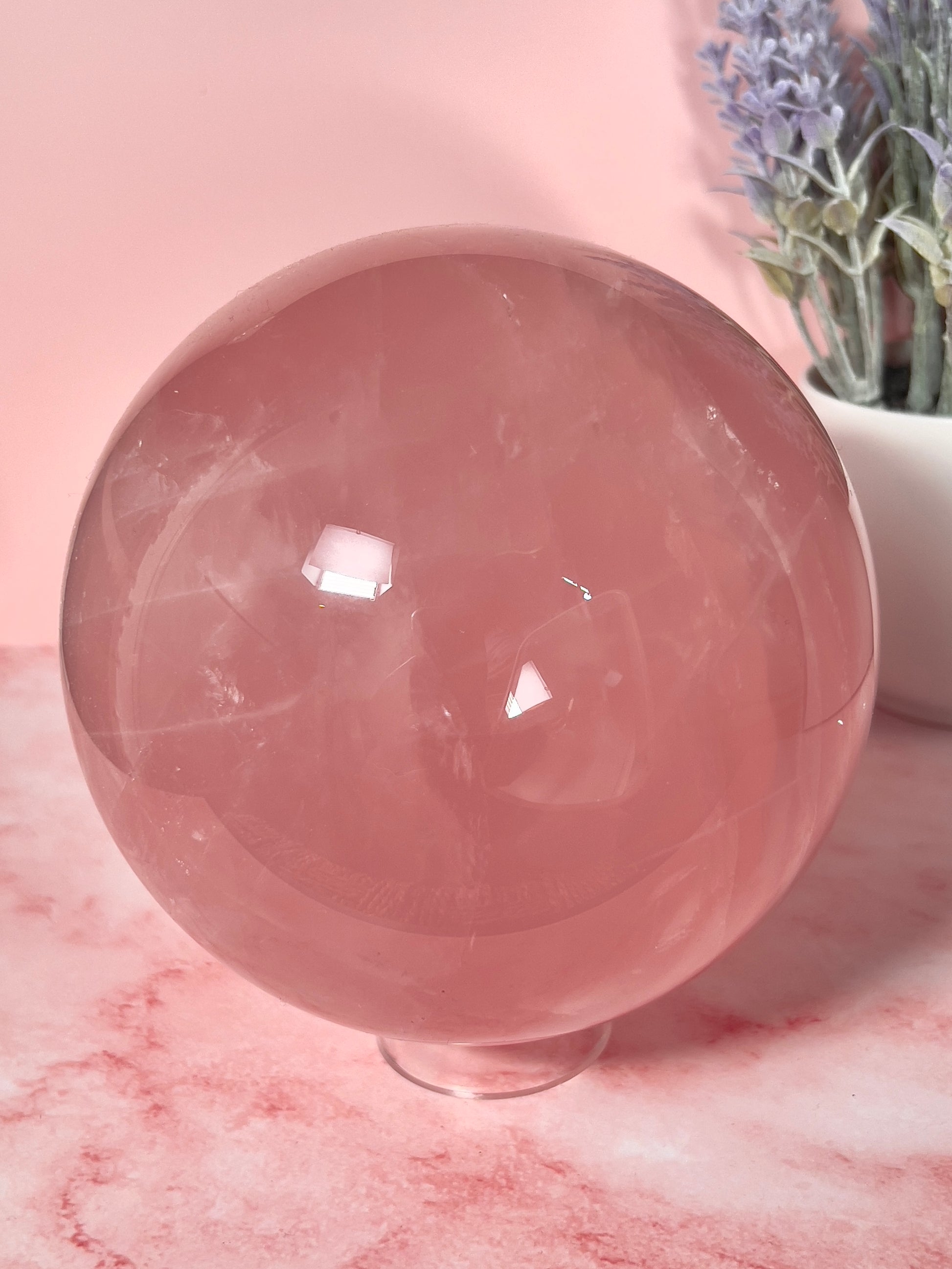 Discover the soothing beauty of this Madagascar rose quartz sphere, a perfectly polished stone showcasing gentle pink hues and natural patterns. Ideal for meditation, crystal collections, or as a decorative accent, each sphere is unique and radiates calming, loving energy.