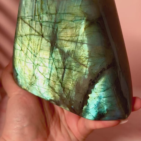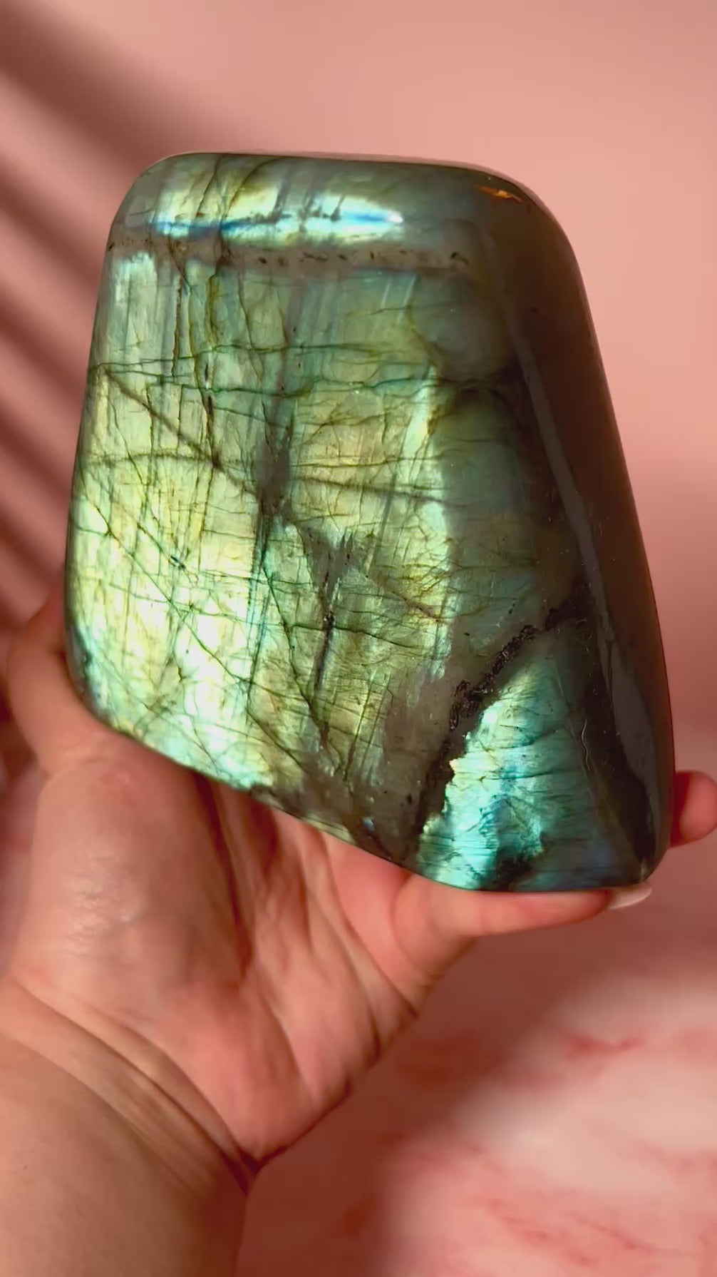 Discover the mesmerizing beauty of this Madagascar labradorite freeform, a unique polished stone showcasing icy green and blue flash. Sourced directly from Madagascar, this one-of-a-kind crystal makes a stunning addition to your collection, meditation space, or home display. Its natural patterns and iridescent shimmer ensure that no two stones are alike.