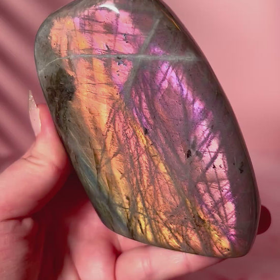 Discover the mesmerizing beauty of this Madagascar labradorite freeform, a unique polished stone showcasing rainbow flashes of pink, orange, and yellow. Sourced directly from Madagascar, this one-of-a-kind crystal makes a stunning addition to your collection, meditation space, or home display. Its natural patterns and iridescent shimmer ensure that no two stones are alike.