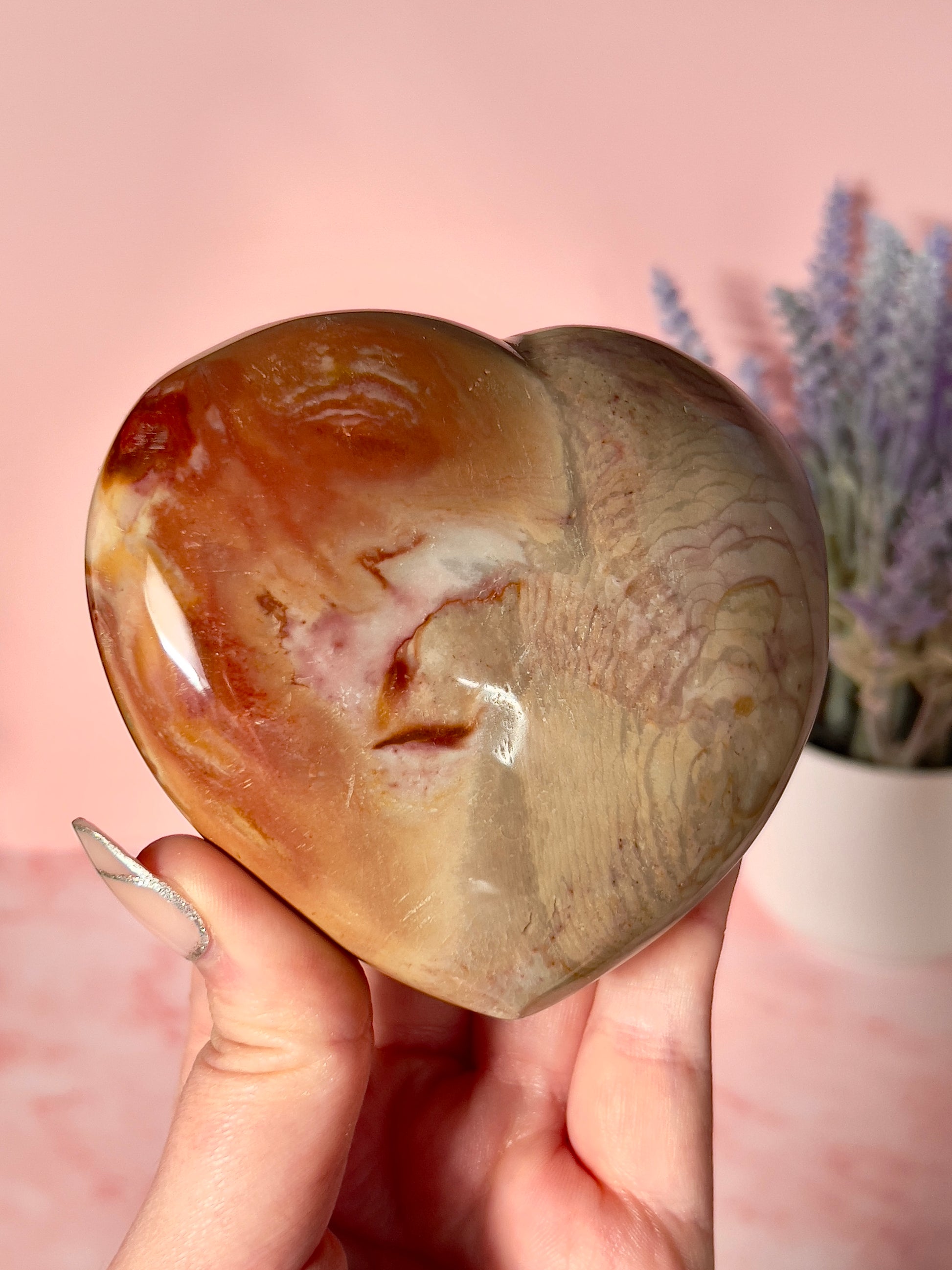 Embrace the warm, grounding tones of this Madagascar earthy beige and brown puffy polychrome sea jasper heart. Smooth and polished, its soft, rounded shape highlights natural swirls of beige, brown, and cream. Perfect as a decorative piece, meditation aid, or meaningful gift.