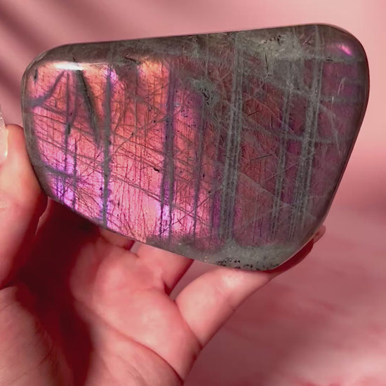 Discover the mesmerizing beauty of this Madagascar labradorite freeform, a unique polished stone showcasing rainbow flashes of pink, purple, and orange. Sourced directly from Madagascar, this one-of-a-kind crystal makes a stunning addition to your collection, meditation space, or home display. Its natural patterns and iridescent shimmer ensure that no two stones are alike.